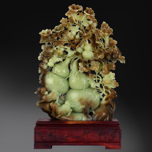 作品中雕刻一顆葫蘆藤,兩顆大葫蘆,藤上掛著幾顆小葫蘆,雕工精湛,形象逼真。葫蘆自古被視為一種寶物,從葫蘆里倒出來的藥品能治百病,使人健康長壽。又因葫蘆多子,舊時寓意多子多孫多福氣。
