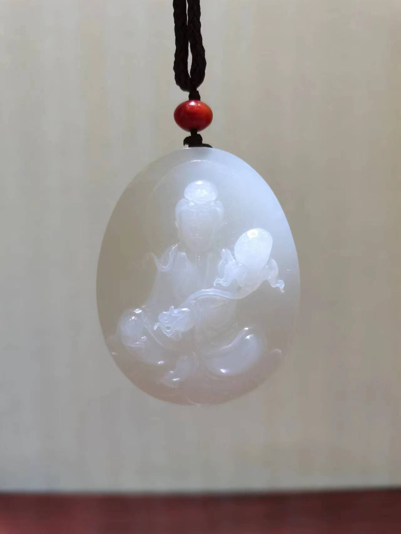 正面深浮雕觀音,這樣的雕刻手法使得觀音更為立體,背面留白,完美的凸顯了玉質優良,玉牌形制,更顯溫潤之感。雕刻大鵬鳥展翅飛翔,寓意心存天地,志向遠大。觀音安坐于蓮花上,所呈現出來的禪意,寧靜溫潤、通透自然。唯有繁華閱盡,才看得見樸素的美。為適合胸前佩戴之佳品。