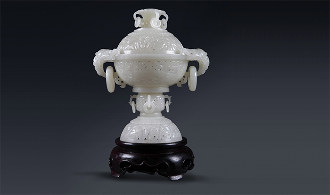 玉質(zhì)潤(rùn)白細(xì)糯、晶瑩飽滿、料大難得,細(xì)膩?zhàn)虧?rùn)如羊脂,通透如瑩瑩白雪。整體以立體鏤雕為主,刀法精細(xì),隨形施藝,惟妙惟肖的圓巧妙融入其中,構(gòu)成香薰?fàn)t吉祥圓滿的視覺效果。雙耳如意設(shè)計(jì),體形弧曲圓渾,弧度對(duì)稱自然,雙耳鏤空懸掛圓環(huán),清潤(rùn)富貴中包含著古樸雅致之情。作品將玉堅(jiān)潤(rùn)不渝的美德與如意的吉祥寓意結(jié)合,與中國(guó)文化高度契合,不僅極具美感,更傳遞出富貴吉祥、福氣安康、財(cái)運(yùn)連綿、節(jié)節(jié)高升等美好祝福。