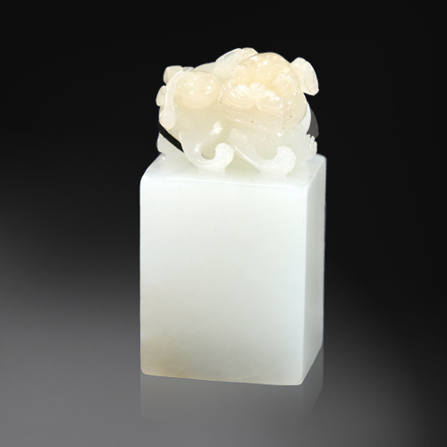 編號:RY32-350 這枚白玉貔貅印章質地溫潤細膩,手感極佳。瑞獸為鈕,牛蹄形足,寬長獅形尾。回首狀,雙眼圓睜,剛勁威猛,上身有糖色,寓意鴻運當頭,這種取用俏色的方法現代而唯美,適宜作辟邪旺財之隨身攜物。
