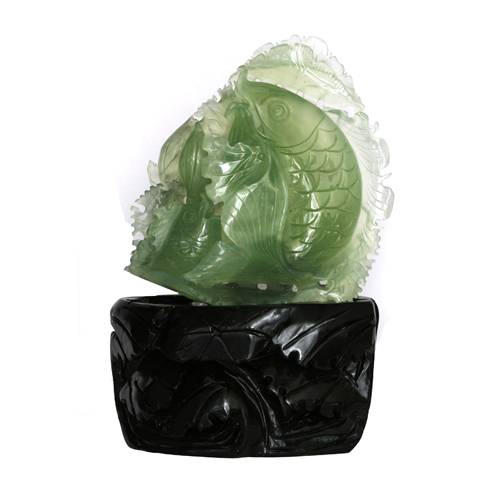 以天然岫玉琢制魚兒及蓮花,魚兒戲蓮,有較好的觀賞效果。玉質清新、綠色鮮嫩,款形大小適中,擺放于案頭閑時欣賞,帶給您一份美好的心情。魚通余,蓮諧音連,寓意連年有余。