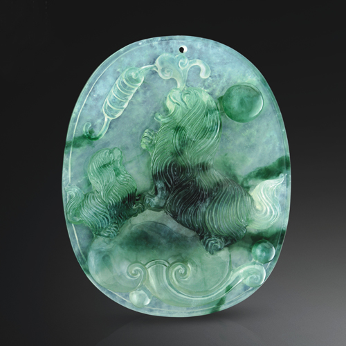 狗狗生動(dòng)活潑,刻畫入微,綠色摘雕巧妙,寓興旺如意。