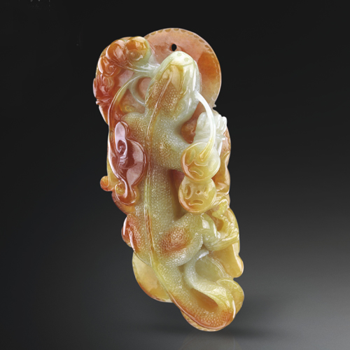 雕刻細(xì)致,翡色純正自然,蜥蜴扭身攀爬,充滿靈性。