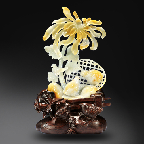 大塊翡色翡翠原石,透過圓雕、鏤雕技法相結合,雕琢鵪鶉和菊花,寓意安居樂業。菊花寫實表現手法,花瓣雕琢栩栩如生;精湛的寫實鏤雕完美地展現了翡翠的色澤魅力。