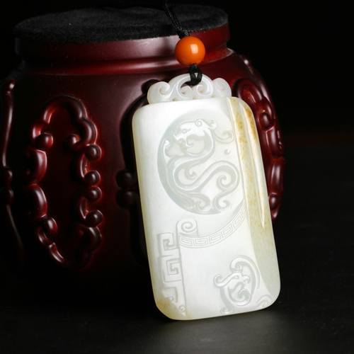 白潤的玉質與超然的氣韻相得益彰,玉脂凝聚,俏麗的秋梨皮更是錦上添花。造型秀雅的玉牌構思巧妙,古意盎然:無論是牌面上方婉轉虬曲的游龍,或是中間細致變幻的回紋、勾連紋,還是下方姿容俊美的鳳首。刀筆行走處,線條流暢曲轉,將剛柔并濟之美發揮得淋漓盡致。 繁復的細節與張弛有度的線條使得作品整體充滿動感,極富藝術感染力。既出行云流水之勢,又現莊嚴肅穆之氣,頗具皇家典雅高貴姿采。